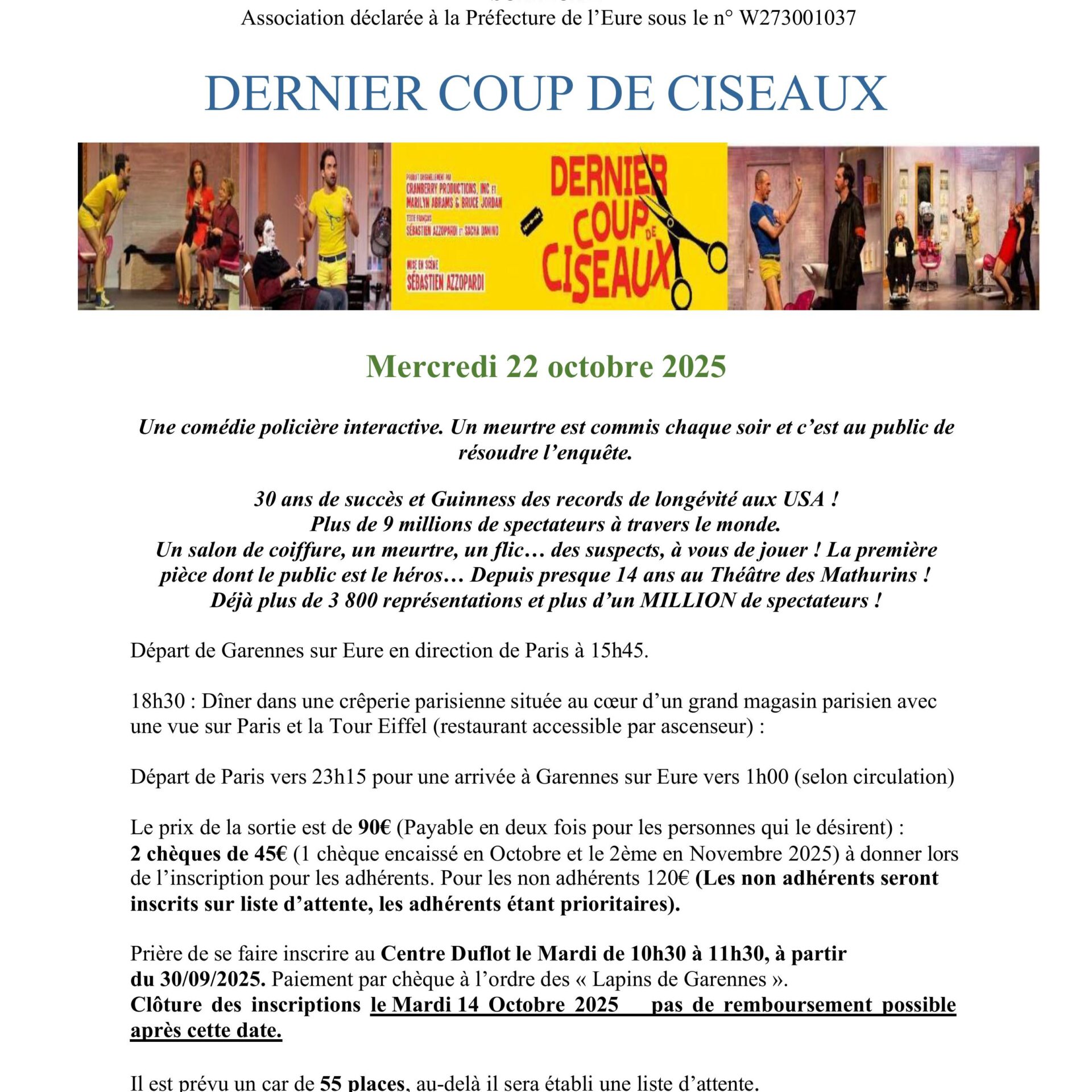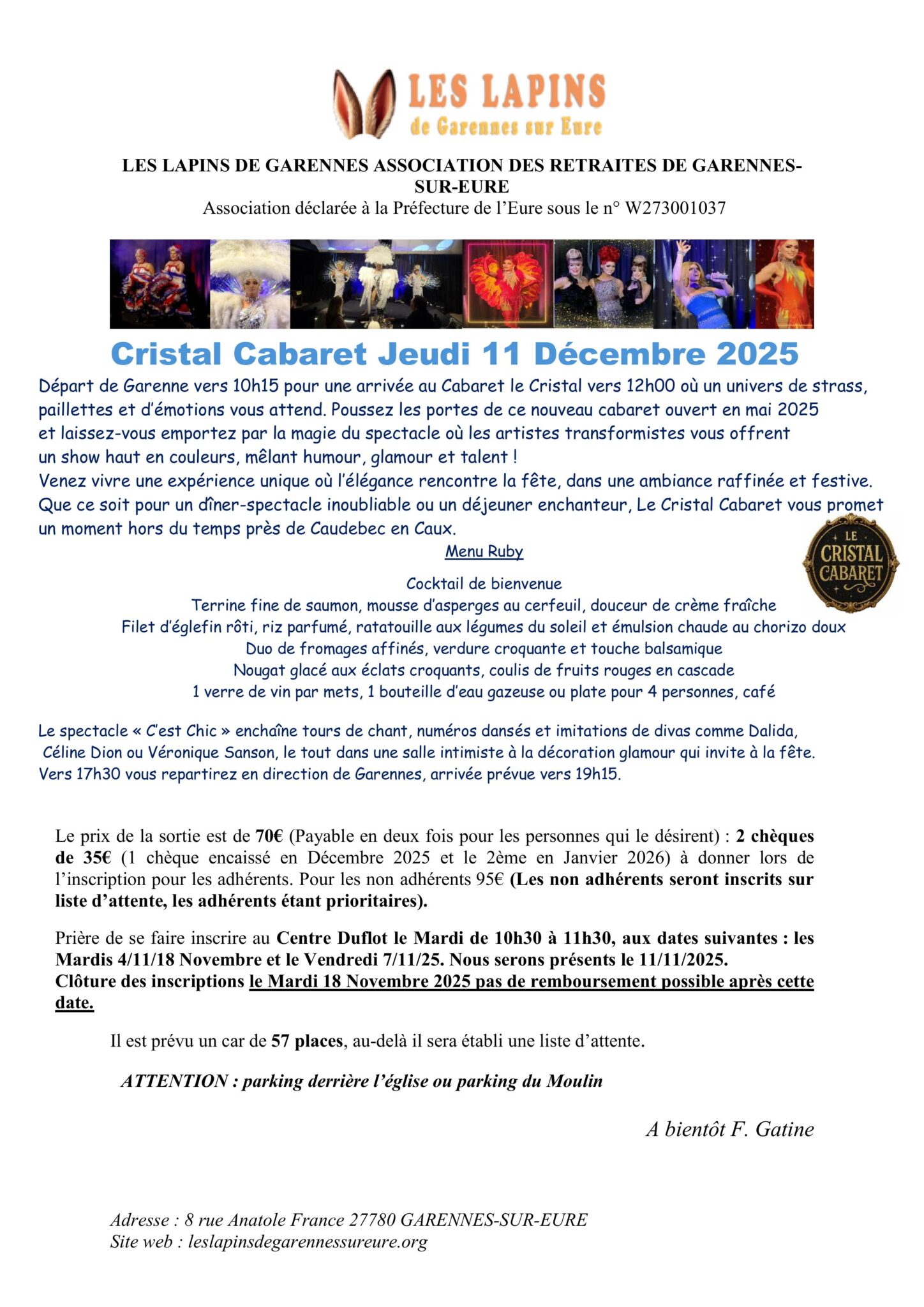 Notre sortie de décembre Bonjour à toutes et tous, Pour terminer l'année nous vous proposons un nouveau Cabaret. Pour les inscriptions , exceptionnellement vous pourrez aussi vous inscrire le vendredi 7 novembre de 10h à 12h, pour vous facilit ...