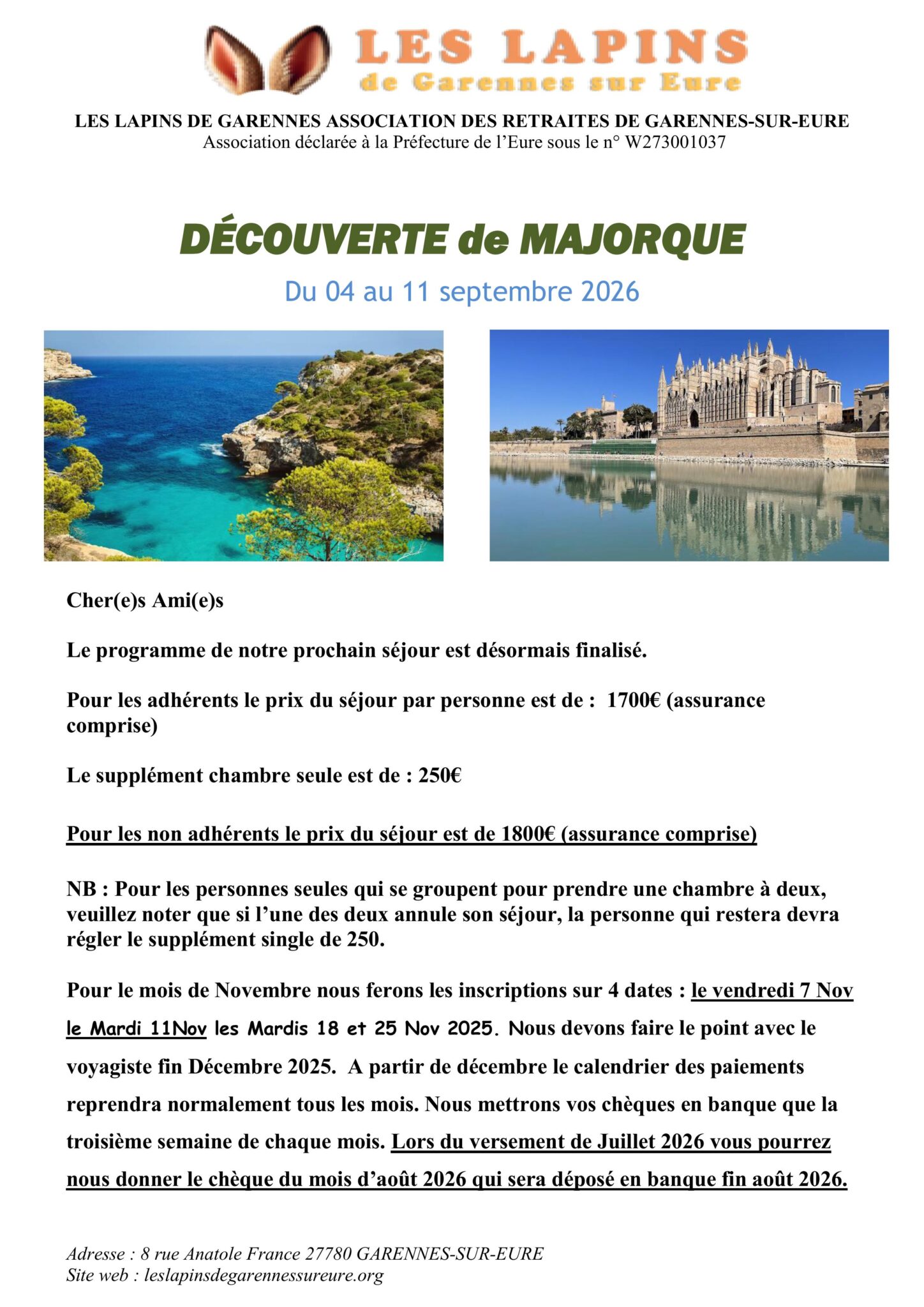 voyage 2026 4 novembre 2025 Sans catégorie voyage 2026 à Majorque Le bureau vous propose pour septembre 2026 une escapade à Majorque qui est l’une des îles espagnoles des Baléares, Previous Post Ezy-Sur-Eure Next Post Garennes-Sur-Eure